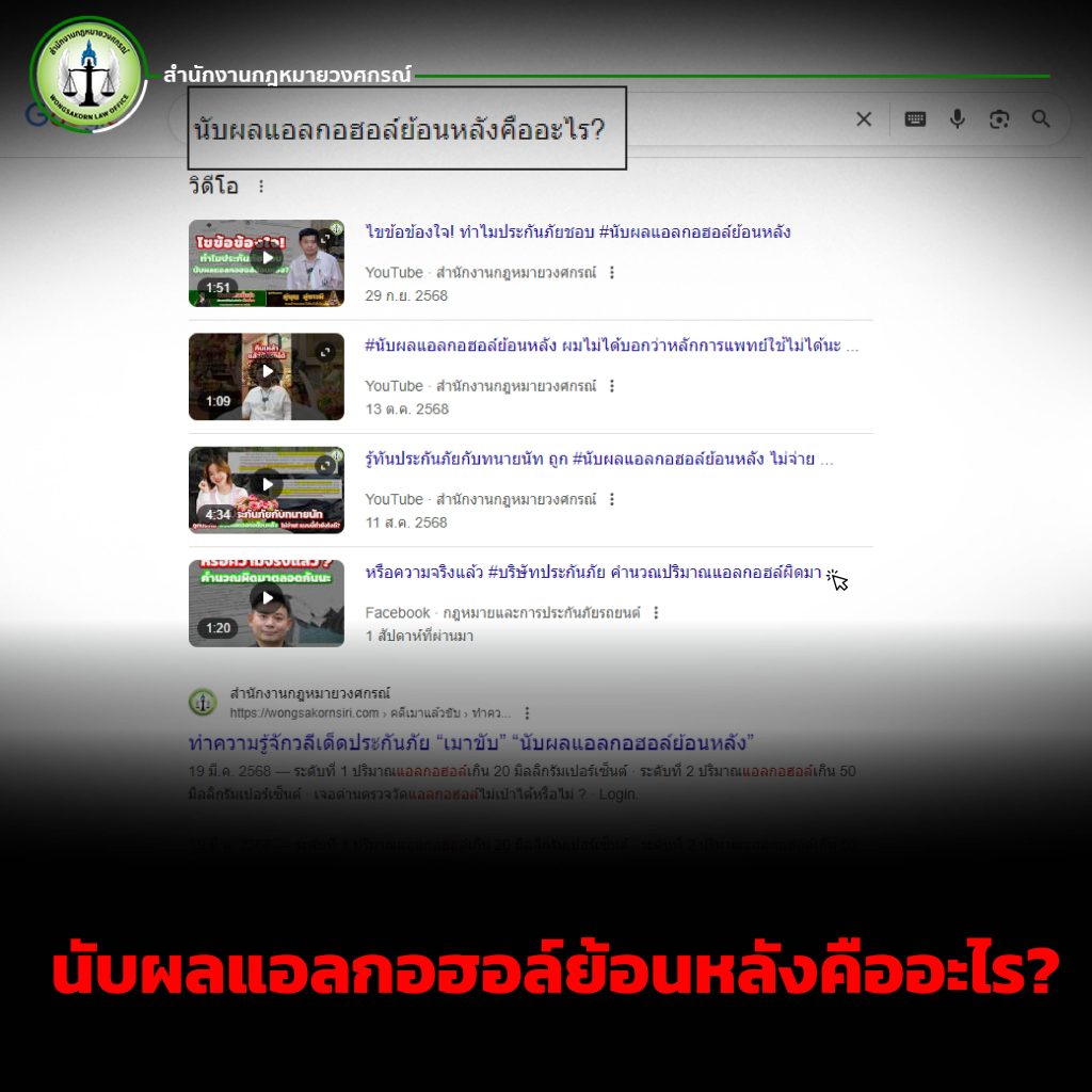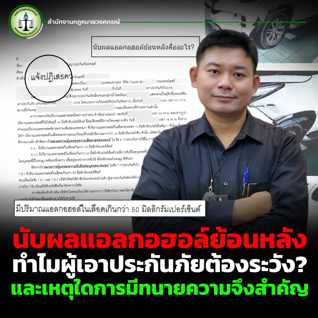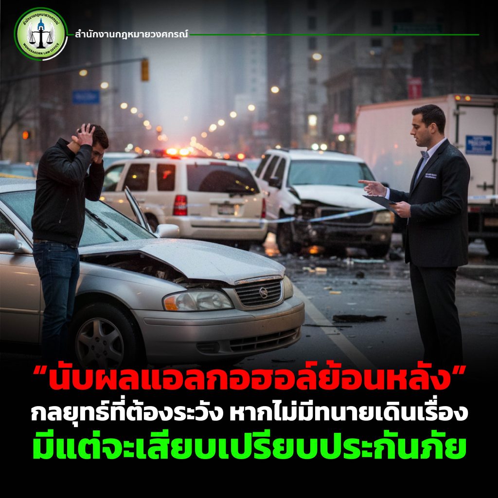 บทความนี้จากสำนักงานกฎหมายวงศกรณ์จะพาไปทำความเข้าใจว่า “นับผลแอลกอฮอล์ย้อนหลัง” คืออะไร ทำไมผู้เอาประกันภัยต้องระวัง และเหตุใดการมีทนายความตั้งแต่แรกจึงเป็นเกราะป้องกันชั้นดีในการต่อสู้ทางกฎหมายและการเจรจาเรียกร้องค่าสินไหม