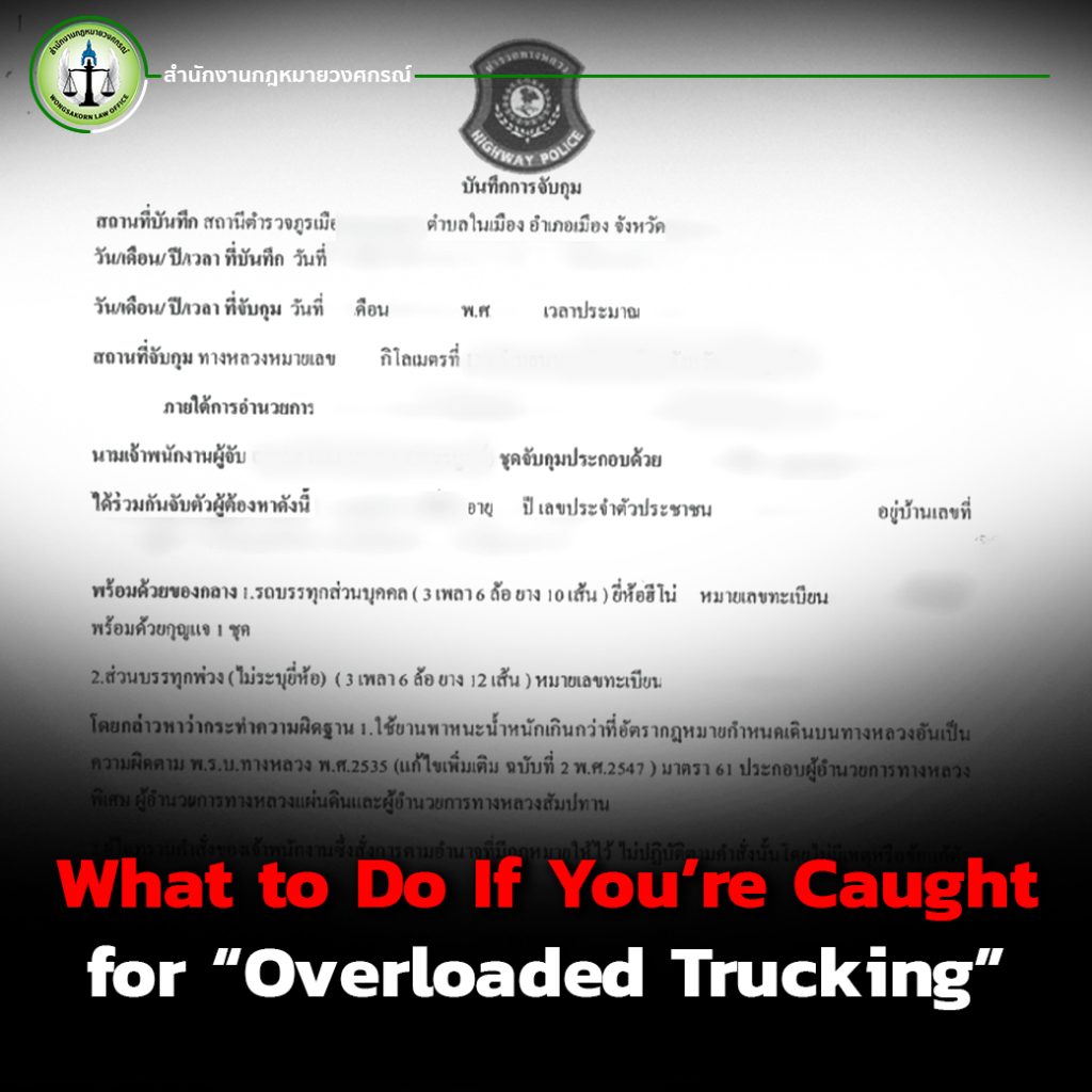 Overloaded Trucking Is Not a Small Matter Being charged or prosecuted for this offense can affect your business operations, reputation, and financial stability. If you or your team faces this situation, stay calm and seek legal counsel promptly to ensure your case is handled correctly and to minimize future risks. For immediate legal consultation, please contact Wongsakorn Law Office.